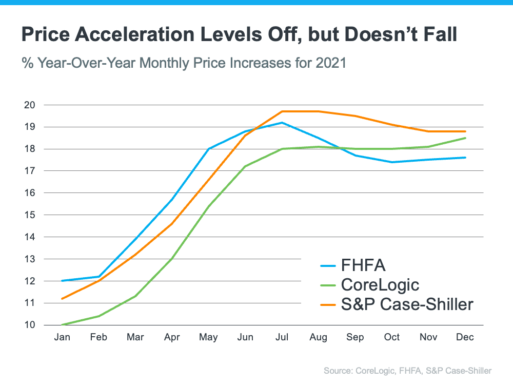 As the graph above reveals, last year, home price appreciation accelerated dramatically from January to July according to all three indices. Then, it began to decelerate in August when prices appreciated at a slower pace, but it didn’t decline. Many thought that would be the beginning of a rapid slowdown in the level of home price appreciation, but as the data shows, that wasn’t the case. Instead, prices began to level off for a few months before two of the three indices saw appreciation re-accelerate again in December.